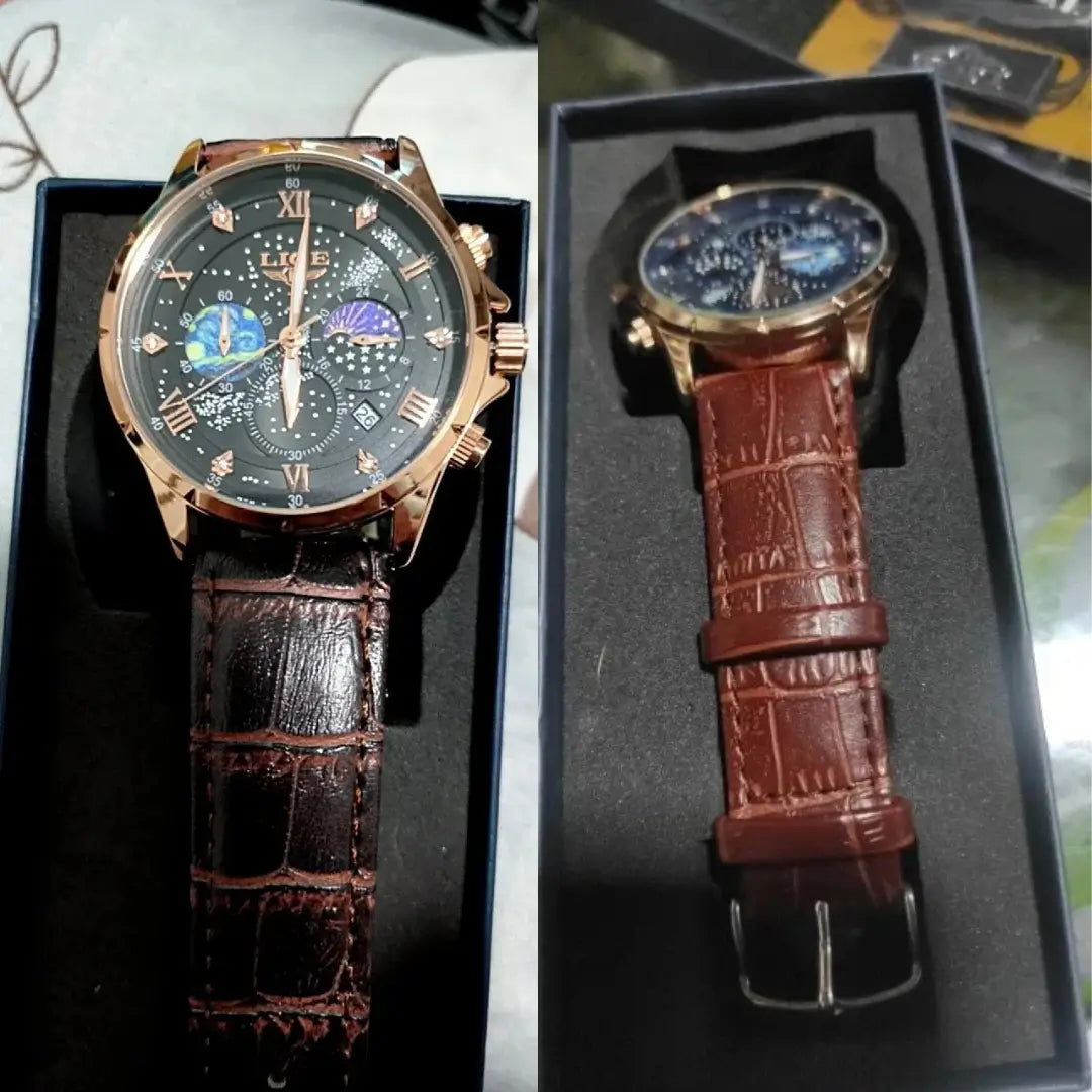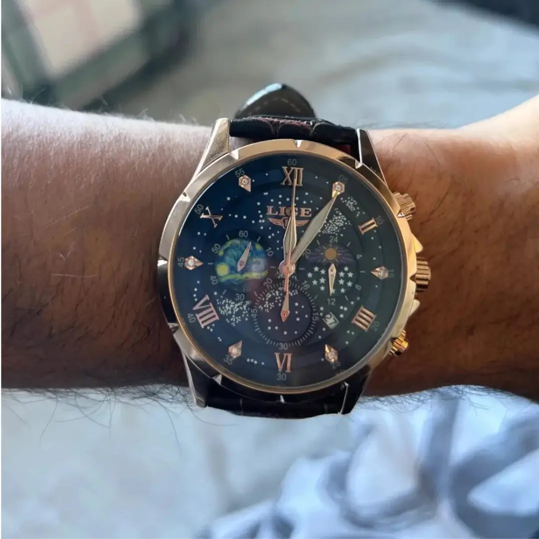 O Relógio de Couro Masculino LIGE é o equilíbrio perfeito entre clássico e inovação funcional. Seu mostrador de design celeste com fase da lua e subdials multifuncionais faz deste modelo um verdadeiro destaque para homens que valorizam estilo, precisão e presença.